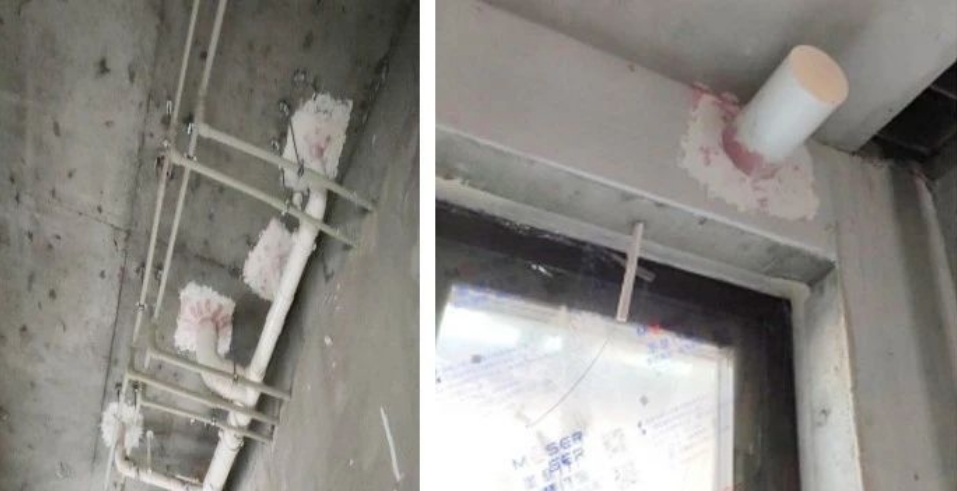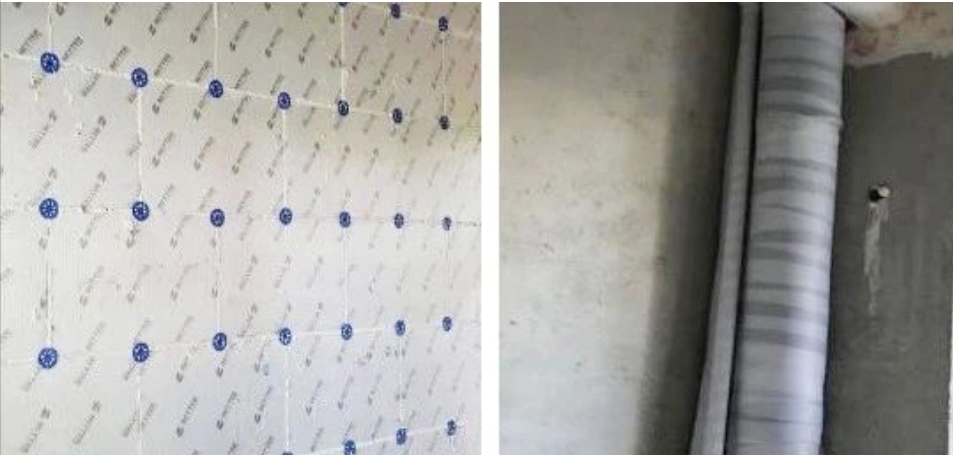 穿分戶樓板粘貼防水隔汽膜(左),穿墻管道室內一側粘貼防水隔汽膜