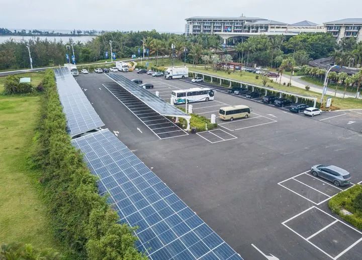 2025年3月16日在海南博鰲零碳示范區(qū)拍攝的建有光伏發(fā)電設(shè)備的停車場(無人機(jī)照片)。新華社記者 蒲曉旭 攝