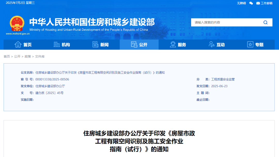 【住建部辦公廳】關于印發《房屋市政工程有限空間識別及施工安全作業指南(試行)》的通知