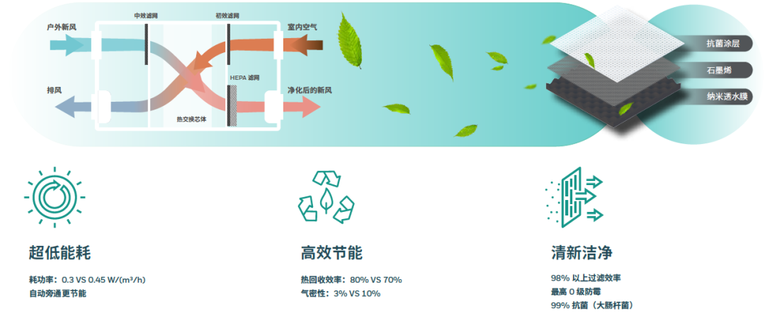 室內精裝系統選用霍尼韋爾ERV高效熱回收新風系統,集空氣置換、新風凈化、能量回收于一體,將室外新鮮空氣經過高效過濾凈化后輸入室內,排風和送風通過高效熱回收芯體進行能量交換,對排風中的冷熱量進行回收利用,以對室外新風進行預冷或預熱,有效降低室外新風帶來的建筑冷熱負荷需求。