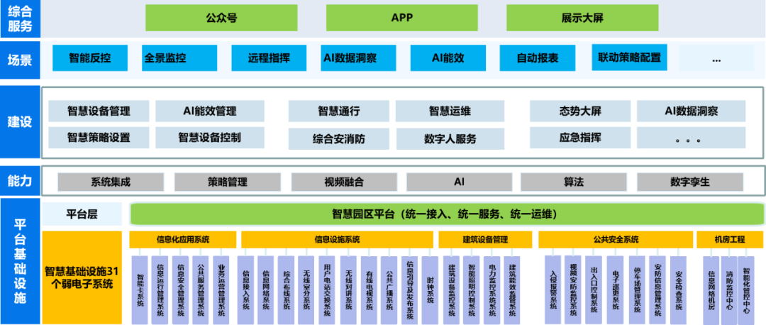 項(xiàng)目建立、完善了31個(gè)智能化子系統(tǒng),建立了1個(gè)智慧會(huì)展平臺(tái)(基于BIM建筑物全信息管理、安保平臺(tái)、能源管理平臺(tái)、智慧消防平臺(tái)、運(yùn)維管理平臺(tái)等多場(chǎng)景應(yīng)用),6大智能化系統(tǒng)(信息化應(yīng)用系統(tǒng)、智能化集成系統(tǒng)、信息設(shè)施系統(tǒng)、建筑設(shè)備管理系統(tǒng)、公共安全系統(tǒng)、機(jī)房工程),31個(gè)智能化子系統(tǒng)(其中3個(gè)創(chuàng)新項(xiàng),13個(gè)提升項(xiàng))。該智慧化平臺(tái)建設(shè)總體方案可使31個(gè)子系統(tǒng)打破壁壘,通過12個(gè)融合工具改變其運(yùn)營(yíng)方式,同時(shí)多個(gè)創(chuàng)新應(yīng)用智慧賦能,100余個(gè)功能模塊協(xié)同支撐。