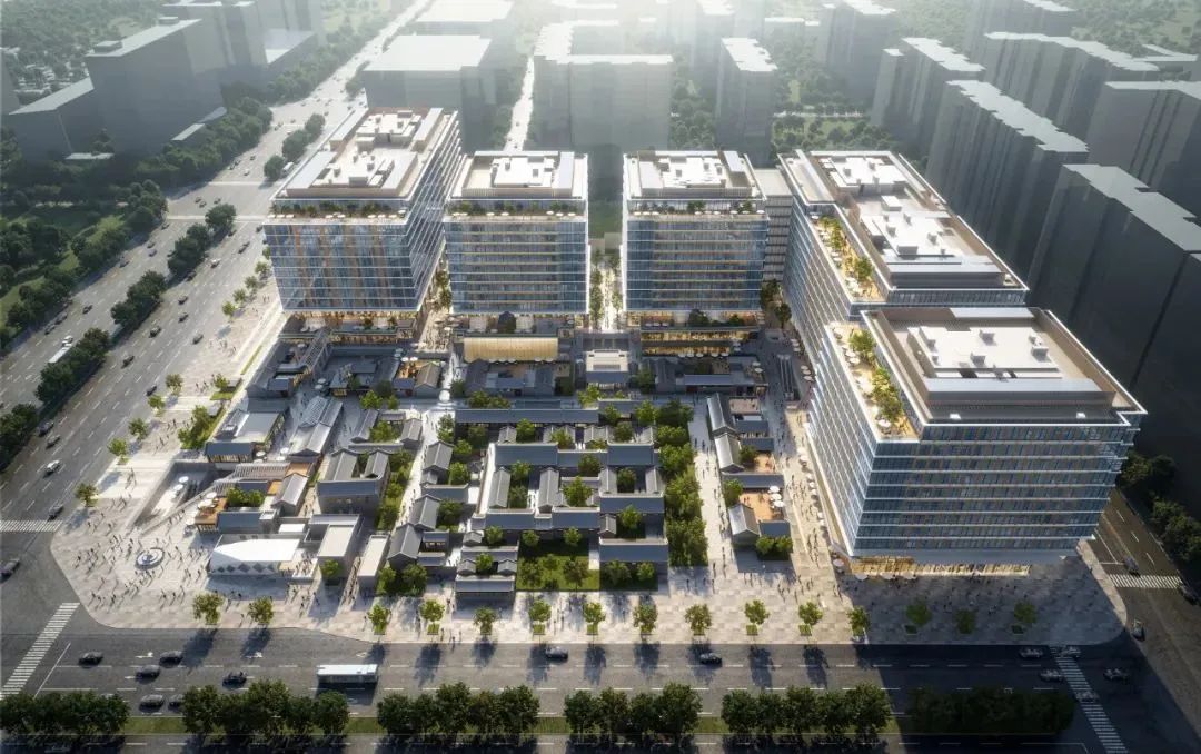 尊重空間基因,構建開放肌理。項目遵循“致敬、傳承、引領、展望”的設計理念,優化統籌城市設計,保留了米市胡同、北大吉巷、保安寺街三條歷史胡同肌理,融三條歷史胡同于上下聯動的“兩縱三橫”漫步規劃結構,退讓城市空間占用地面積的70%,把文物保護區、綠地、城市肌理織補區、二類建控區、下沉街區、首層連廊與地鐵、道路、公園等城市公共空間聯通融為一體,營造集休閑、商業、辦公為一體的無障礙傳統街坊開放城市空間。