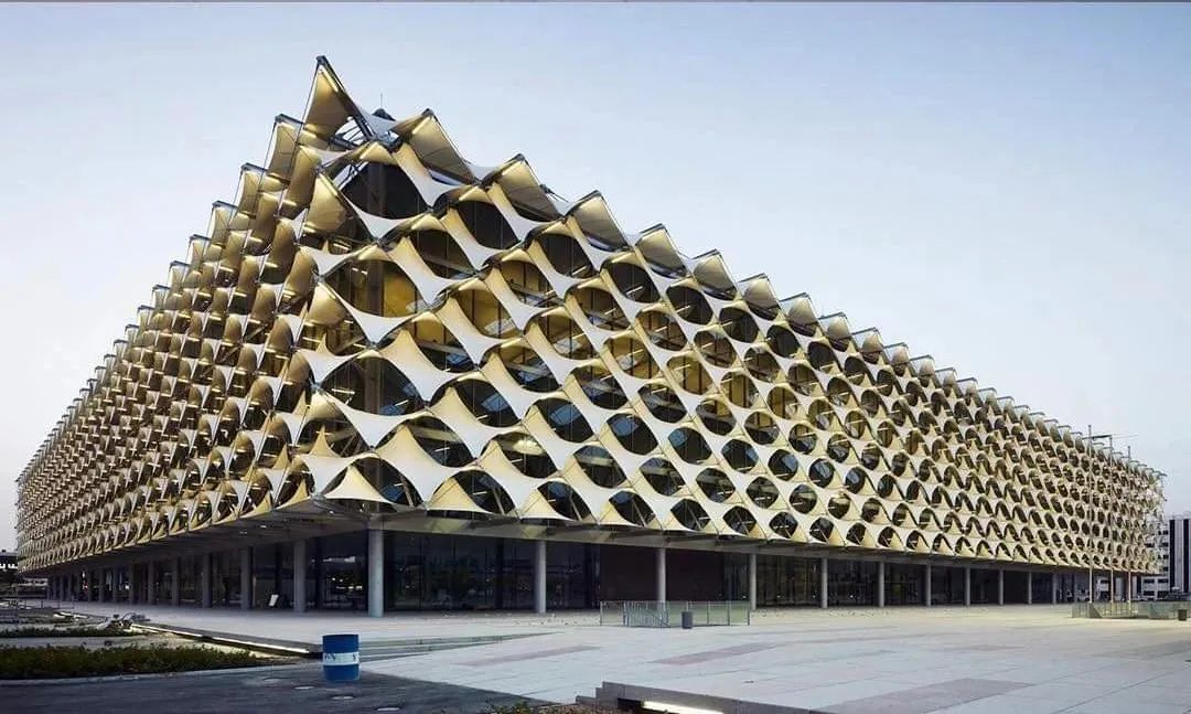 氣候炎熱地區(qū)通常位于太陽(yáng)迅速升高到天空的緯度區(qū)。在這些地區(qū),推薦采用固定的遮陽(yáng)裝置,因?yàn)樵诖蠖鄶?shù)情況下全年都需要遮陽(yáng)。圖2所示是沙特阿拉伯法赫德國(guó)王國(guó)家圖書(shū)館的帆狀遮陽(yáng)裝置。通過(guò)三維模擬計(jì)算,帆狀的幾何形狀最能夠獲得太陽(yáng)能增益最佳遮陽(yáng)效果,同時(shí)能保證視野(圖3)。除了直接陽(yáng)光輻射,通過(guò)幕墻或帆狀結(jié)構(gòu)反射的散射太陽(yáng)光也需予以考慮。