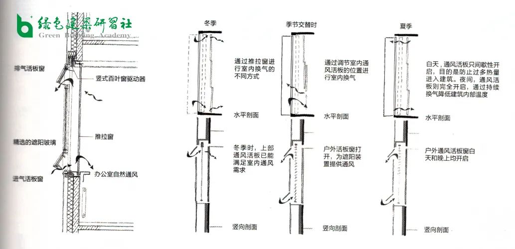 活板窗之后一定距離的位置,安裝了推拉玻璃窗,用戶(hù)可在任何時(shí)候推拉窗戶(hù)。冬季,活板窗上部打開(kāi),形成自然通風(fēng);夏季,兩邊活板窗都打開(kāi)。室內(nèi)可推拉的玻璃窗則仍然由用戶(hù)根據(jù)戶(hù)外氣候(風(fēng)、太陽(yáng)、溫度)自主開(kāi)關(guān)。夏季可打開(kāi)活板窗,一直保持遮陽(yáng)裝置的自然通風(fēng),這意味著室內(nèi)制冷荷載始終保持較低水平。晚上,活板窗也可以提供很好的夜間通風(fēng)(圖5)。