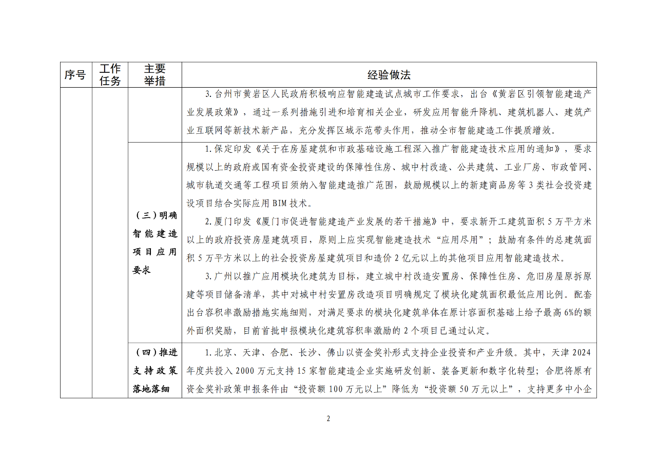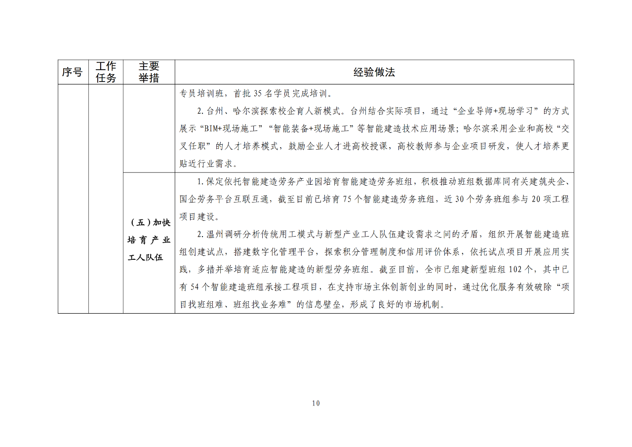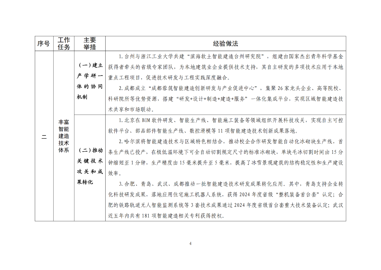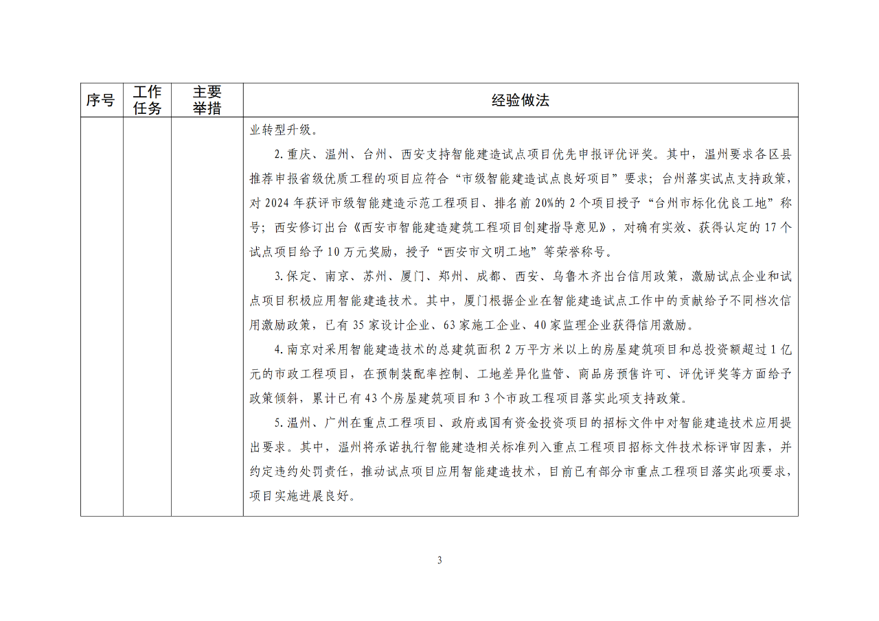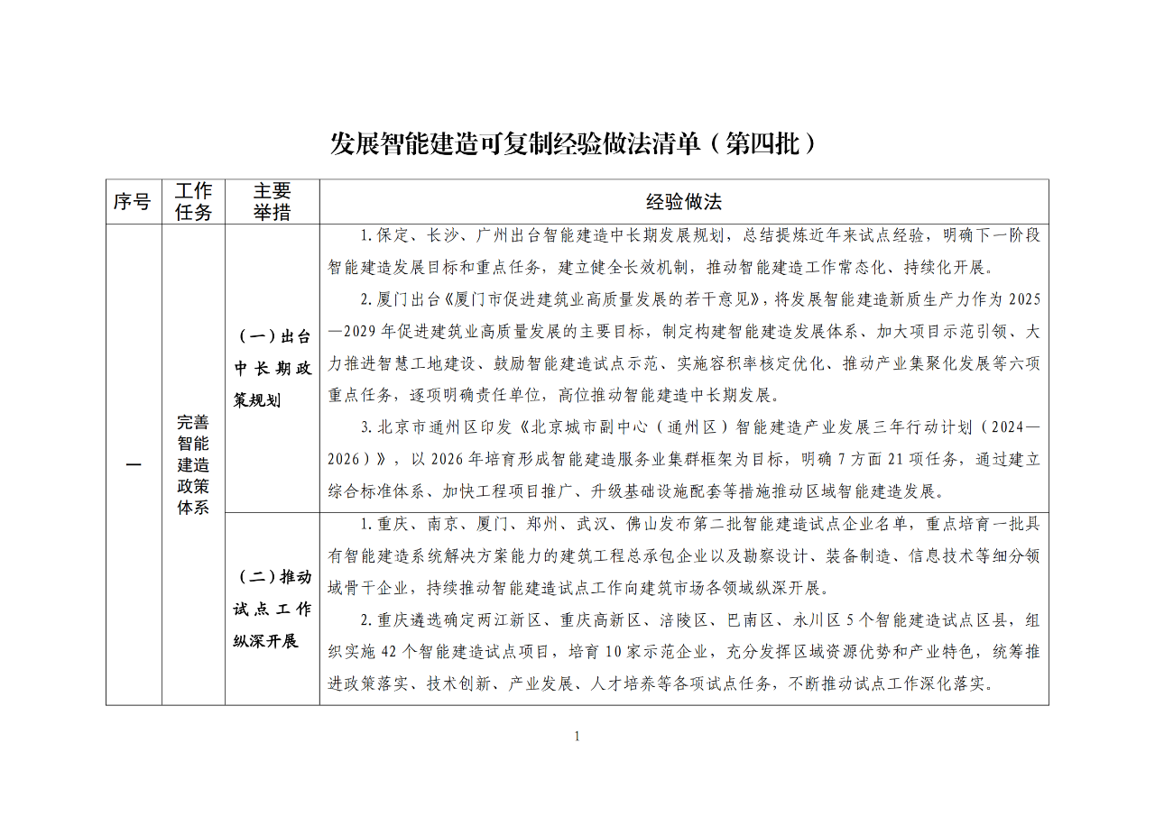 按照《住房和城鄉建設部等部門關于推動智能建造與建筑工業化協同發展的指導意見》(建市〔2020〕60號)、《住房和城鄉建設部關于公布智能建造試點城市的通知》(建市函〔2022〕82號)等文件要求,各地以試點示范為抓手,加快完善發展智能建造的政策體系、產業體系和技術路徑,推動建筑業轉型發展工作取得積極成效。住房城鄉建設部辦公廳印發第四批可復制經驗做法清單,內容如下: