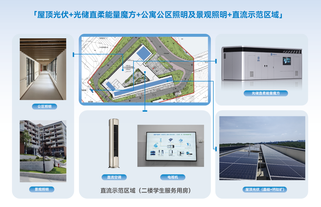 項目位于南京市浦口區(qū),是江蘇省綠建三星暨高品質綠色建筑示范項目,已獲得中國建筑節(jié)能協(xié)會首批光儲直柔三星級評價。公寓頂端鋪設的368平方米太陽能光伏發(fā)電裝置,可將太陽能轉化為電能,通過光儲直柔“能量魔方”,為學校提供高效、穩(wěn)定、柔性用電,搭配使用直流空調等直流設備。通過“直”的高效供配電與“柔”的智能調控協(xié)同,實現(xiàn)綠電100%自消納,打造零碳校園標桿。