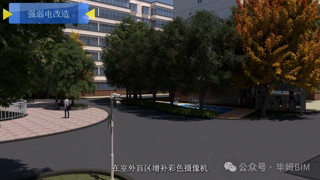 智慧安防預集成:在模型中預演智能安防系統部署,精準定位熱成像攝像機(覆蓋128個充電車位)、人臉抓拍盲區補點及監控中心鏈路,實現“線纜入地、桿路合并”的整潔空間。