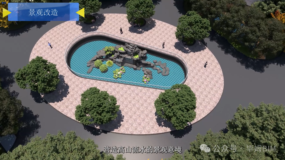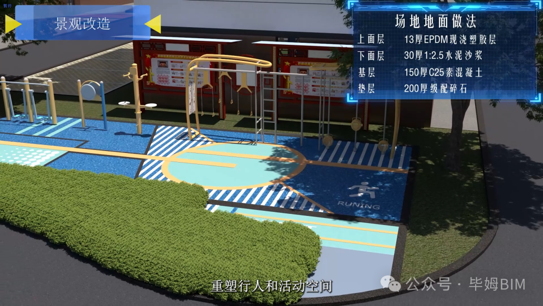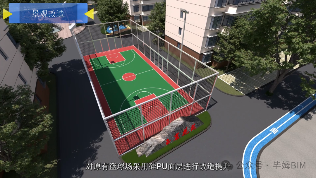 景觀改造沉浸式推演:通過BIM+GIS融合技術,模擬中心噴泉循環系統水力路徑、硅PU籃球場排水坡度及透水游步道(15cm碎石+15cm透水混凝土)生態效益,確保功能與美學統一。
