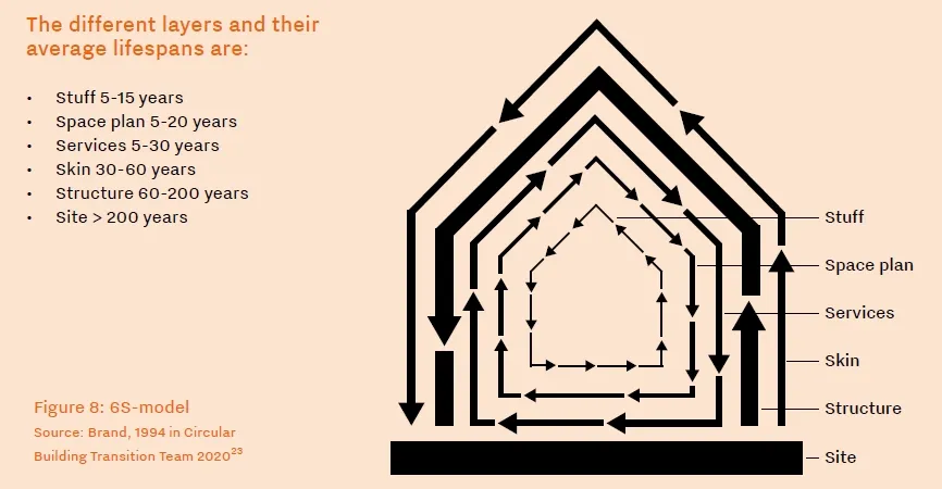 建筑物的設計通常考慮到特定的目的。然而,建筑物的使用會隨著時間的推移而變化,建筑物的不同部分并不都能持續相同的時間(如上圖)。有意識地思考不同層的不同壽命,并將建筑內的層分開,能夠最終使建筑使用更長時間。