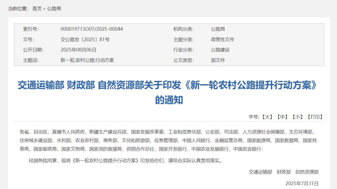 8月6日,交通運輸部、財政部、自然資源部聯合印發《新一輪農村公路提升行動方案》,提出: