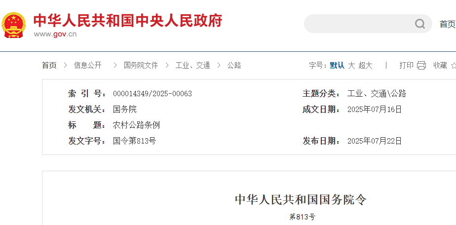 日前,李強總理簽署國務院令第813號《農村公路條例》,自2025年9月15日起施行。