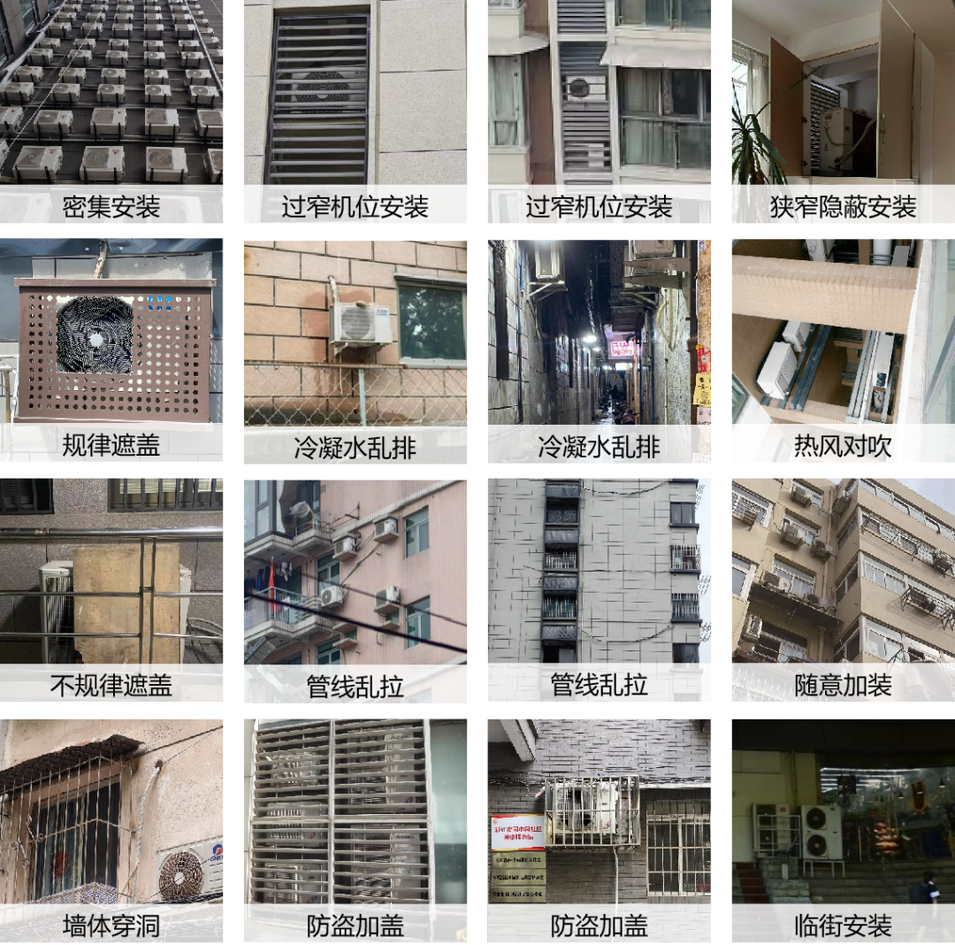 “遮擋”的隱性賬單遠比想象厚重:其一,伯克利國家實驗室的測算,城市制冷負荷每抬升30%,便需額外點燃710座中型燃煤電廠的年發電量,而空調外機罩所激起的負荷增量往往不止此數,也抬高了夏季電網尖峰;其二,密閉的遮擋空間如同蓄熱爐(當環境氣溫攀至40 ℃,罩內可飆升至57 ℃),可能導致壓縮機過熱保護、高壓保護等故障,縮短設備壽命;其三,研究監測顯示家用空調室外機噪聲可達94.5dB,已逾《噪聲污染防治法》晝夜間上限,而遮擋迫使壓縮機高負荷運轉,空氣動力、高頻電磁與低頻振動三重噪聲疊加,讓空調噪聲更加惡化;其四,遮擋構件(尤其是易燃材質)在高溫環境下存在消防隱患,極端高溫會放大風險,也有媒體報道“再現添堵!南京一小區沿街改造后空調外機被“封死””(江蘇政風熱線,2023-08-04),給維修和安全都帶來一定的隱患;其五,一只常規格力外機需0.84m2的罩材,鋁與鋼的生命周期碳排分別達到8.06kgCO?e/m2與121kgCO?e/m2,按2021年全國每百戶131.2臺空調推算,若悉數覆蓋,這筆隱形的碳賬同樣巨大。