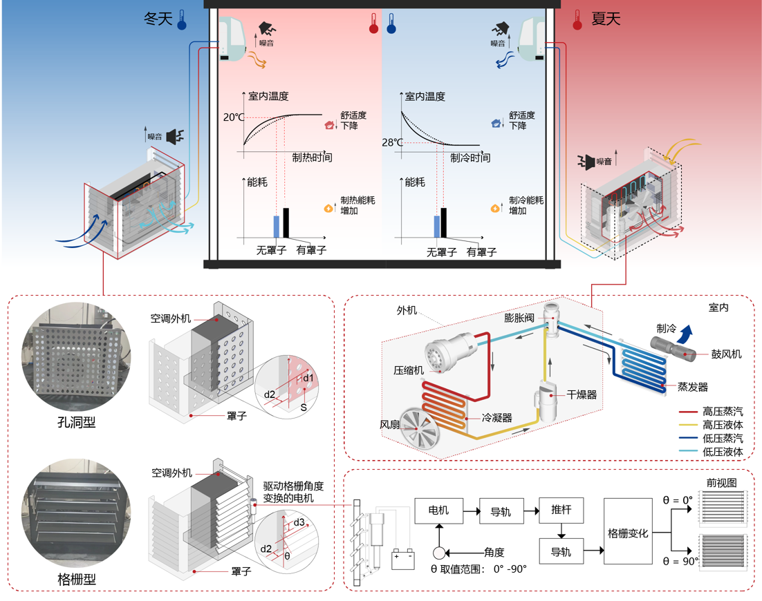 在城市性能的持續觀察中,粗略梳理了分體式空調安裝的典型癥結(如上圖)。為了更精準刻畫空調外機遮擋這一普遍存在的“小問題,大影響”,課題組與格力公司合作,在其蕪湖分公司的焓差實驗室開展了為期一個月的實驗,結合多參數仿真模擬,探究了遮擋的關鍵設計參數對空調系統的影響。隨著研究的不斷深入,揭示了不當的空調外機遮擋設計帶來了系列連鎖反應。