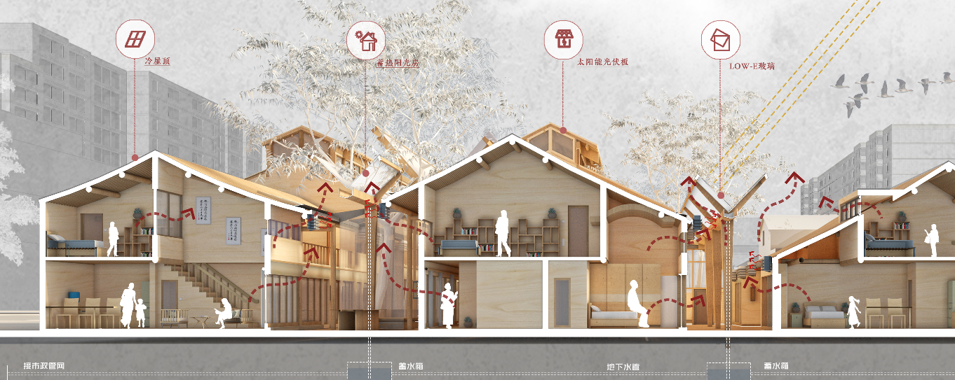空調外機只是綠色建筑宏大敘事里的一個逗號,建筑熱管理散落于建筑的每一寸肌理:光伏、屋頂、幕墻、設備……任何單一技術都容易陷入“按下葫蘆浮起瓢”的窘境,只有讓多技術策略精準協同,才能觸發“1+1>2”的綠色增益效應。在第二屆綠色建筑建筑設計競賽一等獎的作品《Y-HOUSE——讓庭院隨自然呼吸的木構探索》中,把人頭頂高度的外機排熱當作設計起點:低碳木構為骨架,可變遮陽為皮膚,空調遮擋構件為“導流片”,再把庭院通風系統嵌入其中,熱脅迫感被削去,通過在有機更新中顯著提升了空間舒適性與生態效益。