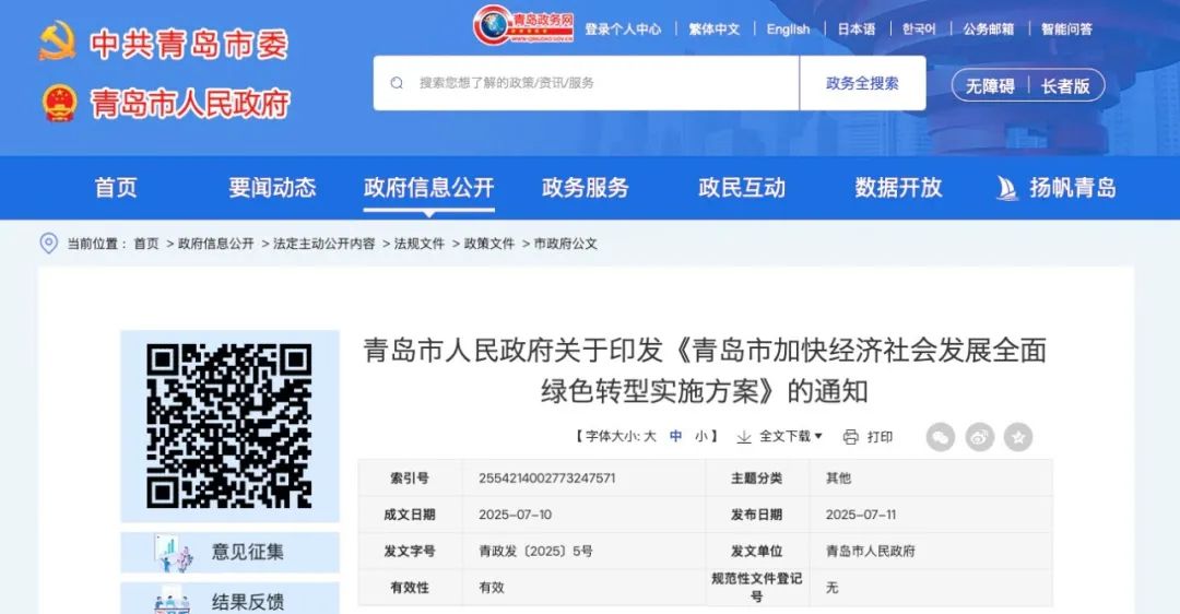 2025年7月10日,青島市人民政府印發(fā)《青島市加快經(jīng)濟(jì)社會(huì)發(fā)展全面綠色轉(zhuǎn)型實(shí)施方案》。