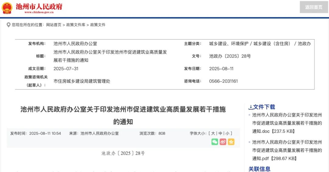 2025年7月31日,池州市人民政府辦公室印發(fā)《池州市促進(jìn)建筑業(yè)高質(zhì)量發(fā)展若干措施》。