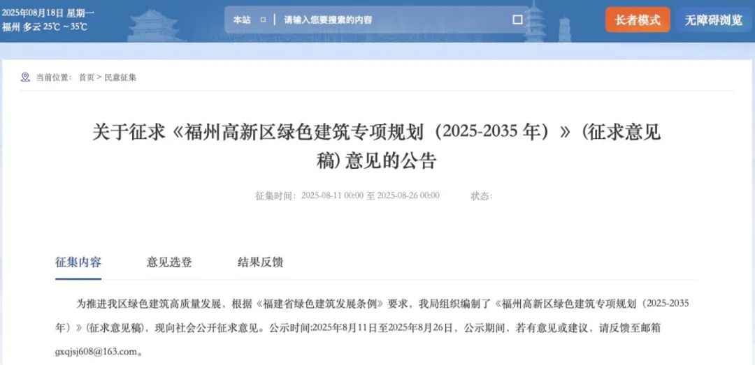2025年8月11日,福州高新區(qū)城鄉(xiāng)建設(shè)局發(fā)布《福州高新區(qū)綠色建筑專項(xiàng)規(guī)劃(2025-2035 年)》 (征求意見(jiàn)稿) ,向社會(huì)公開(kāi)征求意見(jiàn)。