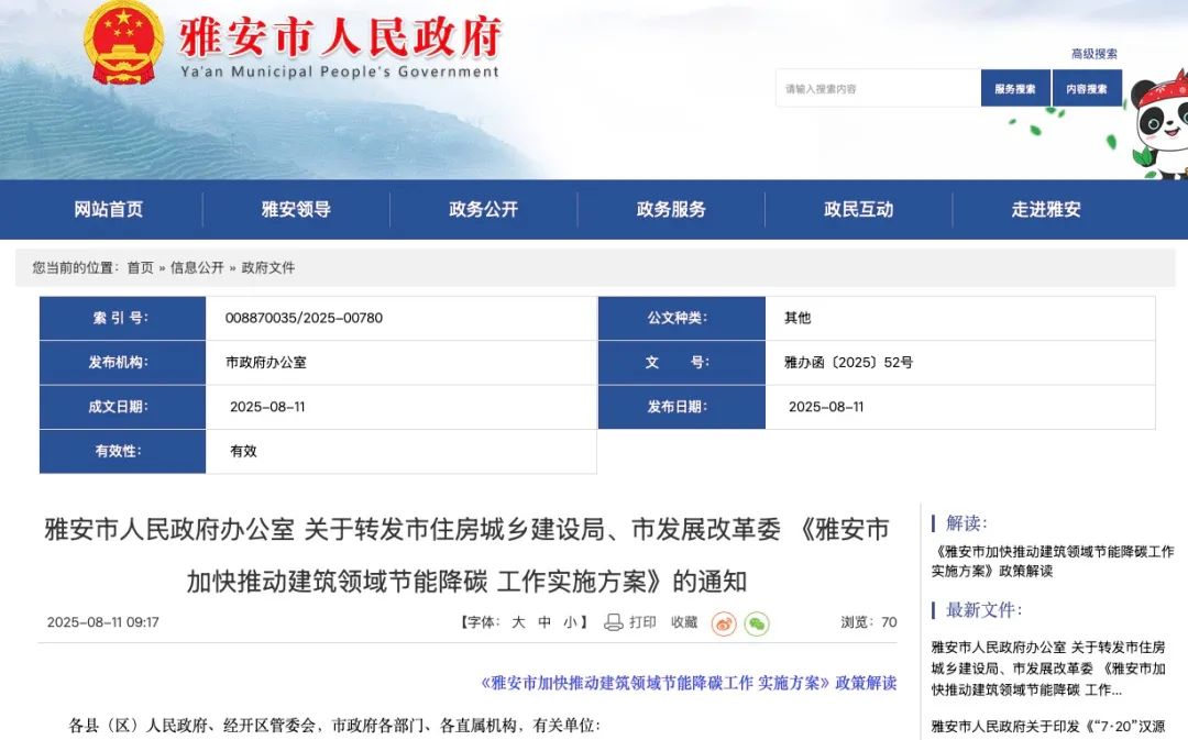 2025年7月24日,雅安市人民政府辦公室轉(zhuǎn)發(fā)市住房城鄉(xiāng)建設(shè)局、市發(fā)展改革委《雅安市加快推動(dòng)建筑領(lǐng)域節(jié)能降碳工作實(shí)施方案》。