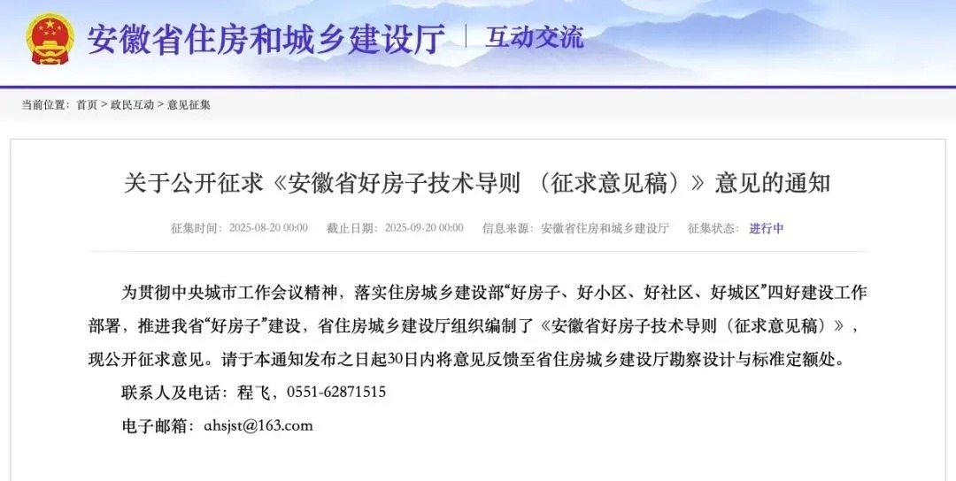 2025年8月20日,安徽省住房和城鄉建設廳發布《安徽省好房子技術導則(征求意見稿)》,公開征求意見。