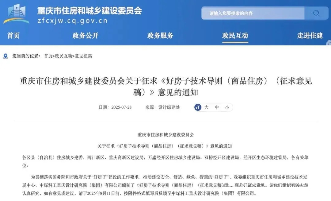2025年7月24日,重慶市住房和城鄉建設委員會印發《好房子技術導則(商品住房)(征求意見稿)》,公開征求意見。