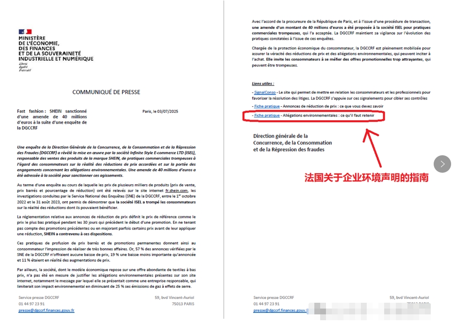20258月,意大利競爭管理局(AGCM)對在歐洲運營Shein在線交易平臺的Infinite Styles Services公司處以100萬歐元的罰款,原因是其綠色聲明具有誤導和遺漏,同時發布了詳細的處罰報告。法國7月也對Shein開具4000萬歐元罰單,理由同樣包括“虛假環境聲明”。