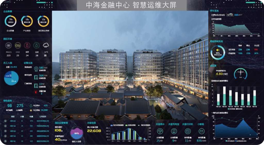 中海金融中心的智慧運維大屏,實現了對園區能源、碳排、環境等數據的可視化、智慧化管理