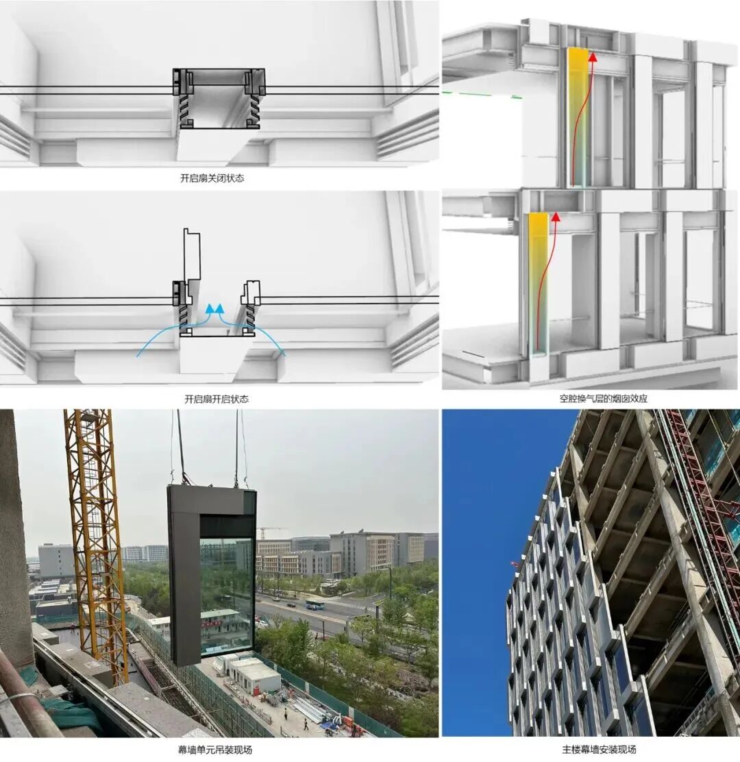 建筑的開啟扇藏于空腔內,在平時可獲得足量的自然通風,緊急情況下可實現辦公區域的自然排煙。單元的內側全部裝飾完成,單元吊掛完成后,室內空間的界面即完成,優化了精裝修和幕墻的交接界面。建筑共千余個標準單元,全部在工廠預制后現場直接吊裝插接完成,高度的預制化大大加快了整體工期。