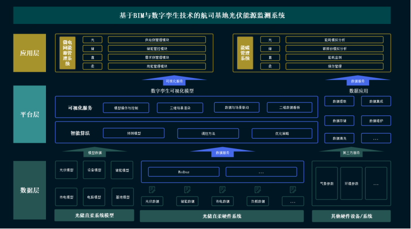 基于BIM與數字孿生技術的航司基地光伏能源監測系統分為數據層、平臺層與應用層。