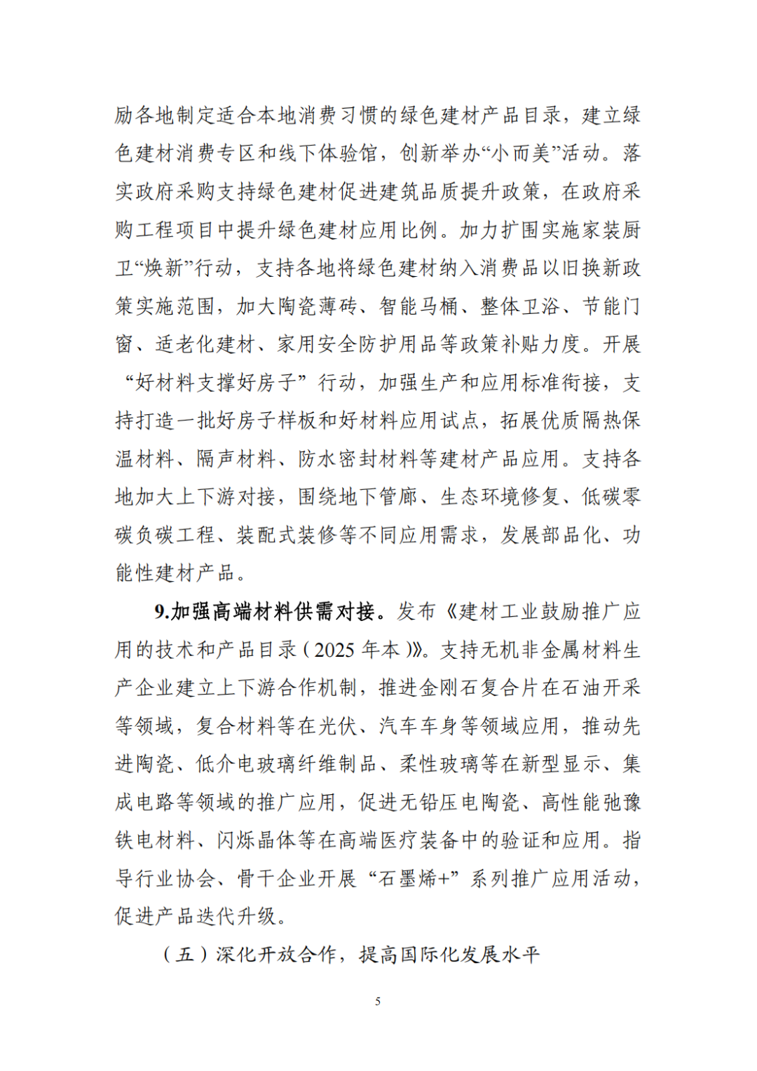 擴需求,挖掘傳統消費潛力、培育新興應用。持續開展綠色建材下鄉活動,落實政府采購支持綠色建材促進建筑品質提升政策;支持建立無機非金屬材料生產企業上下游合作機制,推動金剛石、先進陶瓷、低介電玻璃纖維制品等推廣應用。