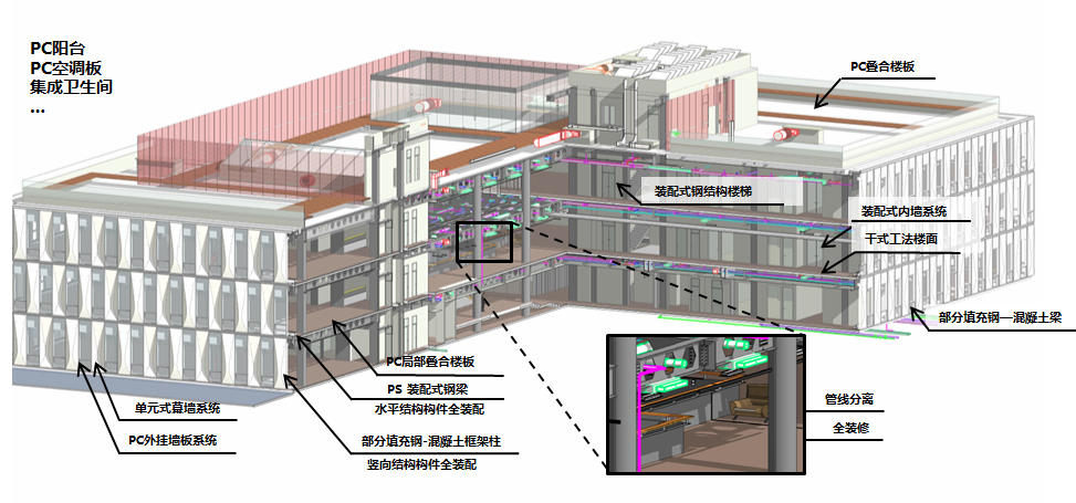 (3)率先提出并全部實(shí)施裝配化裝修;全部采用干式工法樓地面;研發(fā)并應(yīng)用非住宅集成衛(wèi)生間技術(shù);研發(fā)標(biāo)準(zhǔn)化設(shè)備管線槽,集成所有設(shè)備管線,實(shí)現(xiàn)管線與主體結(jié)構(gòu)和墻體完全分離。