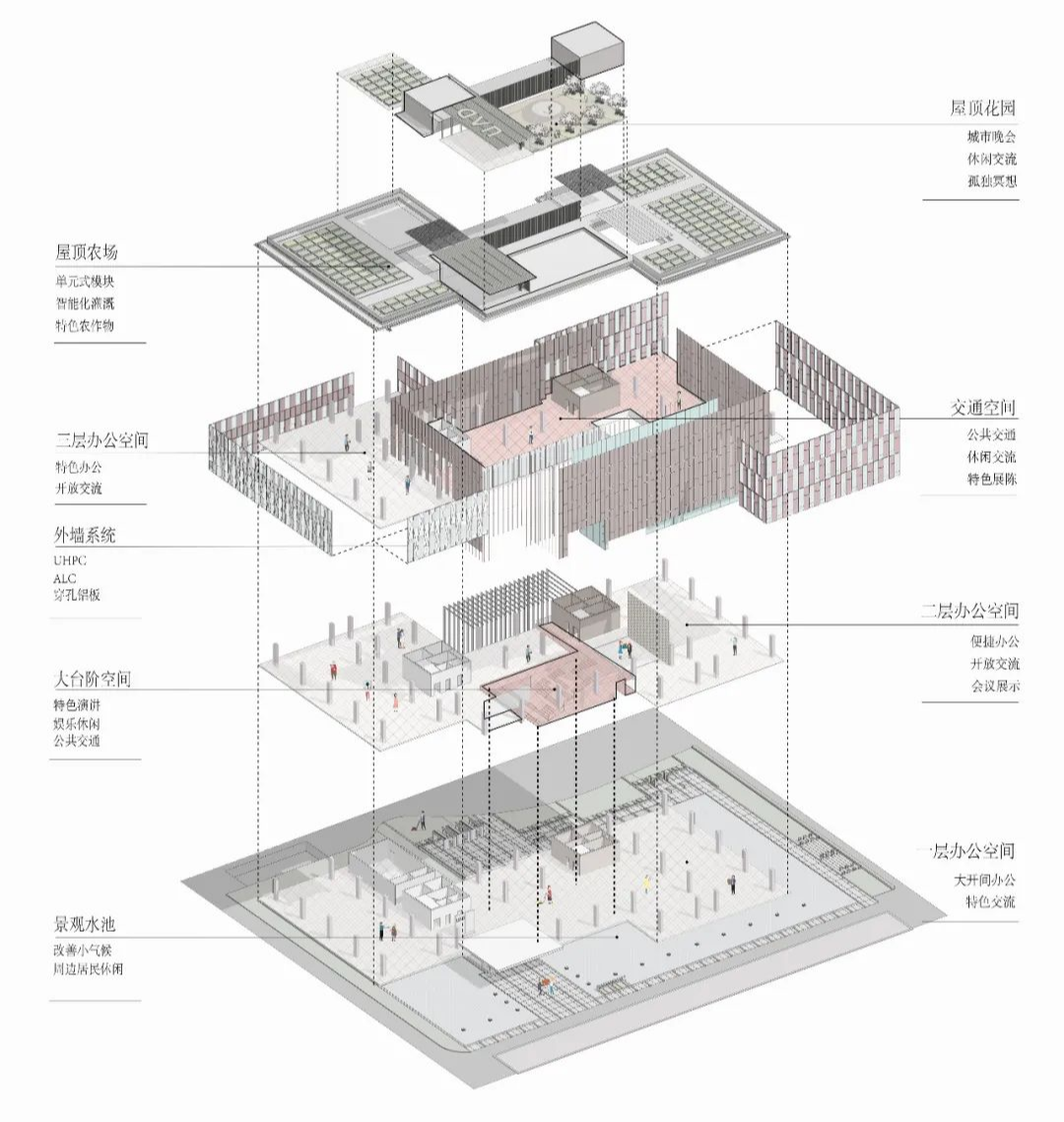 (3)標(biāo)準(zhǔn)化與個(gè)性化平衡:基于系統(tǒng)化模數(shù)體系,采用標(biāo)準(zhǔn)化部品部件,通過(guò)構(gòu)件組合與加工創(chuàng)新實(shí)現(xiàn)個(gè)性化表達(dá)。如一套模具生產(chǎn)正反兩種UHPC墻板,錯(cuò)位拼接形成韻律外立面;標(biāo)準(zhǔn)化鋁板經(jīng)機(jī)器人二次加工,構(gòu)造竹林肌理。