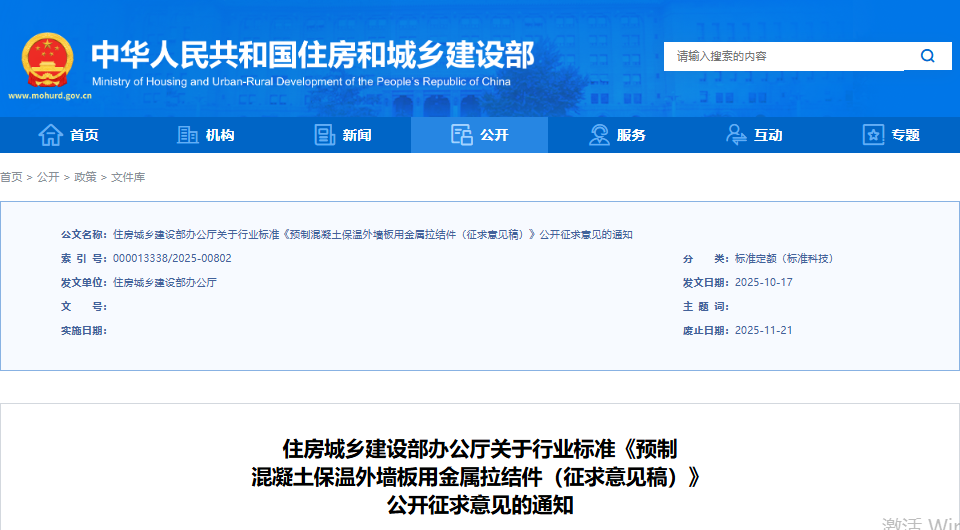 根據(jù)《住房城鄉(xiāng)建設(shè)部關(guān)于印發(fā)2024年工程建設(shè)規(guī)范標(biāo)準(zhǔn)編制及相關(guān)工作計(jì)劃的通知》(建標(biāo)函〔2024〕41號),我部組織中建研科技股份有限公司等單位起草了建筑工業(yè)行業(yè)標(biāo)準(zhǔn)《預(yù)制混凝土保溫外墻板用金屬拉結(jié)件(征求意見稿)》(見附件)。現(xiàn)向社會公開征求意見。有關(guān)單位和公眾可通過以下途徑和方式提出反饋意見: