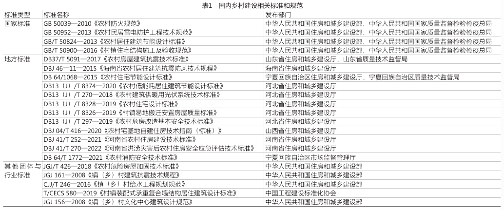 1)鄉(xiāng)村建設(shè)標(biāo)準(zhǔn)。長(zhǎng)期以來(lái),我國(guó)尚未依據(jù)不同自然環(huán)境、行政區(qū)劃、建筑類(lèi)型等研究、編制、頒布、推行鄉(xiāng)村建筑設(shè)計(jì)規(guī)范與標(biāo)準(zhǔn)體系。目前,國(guó)內(nèi)現(xiàn)行的主要鄉(xiāng)村建設(shè)相關(guān)標(biāo)準(zhǔn)和規(guī)范如表1所示,其內(nèi)容與組成均未考慮我國(guó)幅員遼闊的自然地理?xiàng)l件和復(fù)雜多樣的氣候條件。而現(xiàn)行城鎮(zhèn)工程建設(shè)標(biāo)準(zhǔn)數(shù)量眾多、普及面廣,涵蓋內(nèi)容從對(duì)不同地理?xiàng)l件的處理,如GB 55003—2021《建筑與市政地基基礎(chǔ)通用規(guī)范》,到對(duì)不同氣候環(huán)境的應(yīng)對(duì),如GB 50176—2016《民用建筑熱工設(shè)計(jì)規(guī)范》。鄉(xiāng)村現(xiàn)行地方標(biāo)準(zhǔn)僅涵蓋我國(guó)部分地區(qū),如河北省、河南省、山西省、山東省、海南省、寧夏回族自治區(qū)等地,尚未按照行政區(qū)劃進(jìn)行系統(tǒng)編制。與之相反,城鎮(zhèn)現(xiàn)行地方標(biāo)準(zhǔn)相對(duì)完善,各省、市、自治區(qū)都有明確的建設(shè)標(biāo)準(zhǔn)體系。此外,與城鎮(zhèn)建筑類(lèi)型劃分標(biāo)準(zhǔn)體系不同,目前鄉(xiāng)村僅有的標(biāo)準(zhǔn)和規(guī)范幾乎以住宅為主,忽略諸如服務(wù)、生產(chǎn)等其他功能類(lèi)型建筑,更未依據(jù)建筑類(lèi)型系統(tǒng)制定標(biāo)準(zhǔn)和規(guī)范體系。