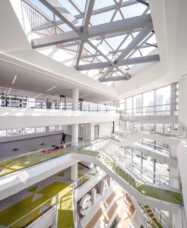 該建筑外窗和幕墻采用透光性良好的材質(zhì)、控制房間進(jìn)深,并利用中庭導(dǎo)入陽光,使室內(nèi)形成良好的雙側(cè)自然采光效果,地下空間則通過導(dǎo)光管系統(tǒng)引入自然光線,滿足人員舒適度的同時減少照明能耗;同時建筑采用智慧照明系統(tǒng),進(jìn)一步減少能耗。建筑外立面采用五玻雙腔玻璃的被動式節(jié)能幕墻,均勻設(shè)置開啟幕墻,室內(nèi)幾乎全空間可實現(xiàn)自然通風(fēng)換氣次數(shù)不小于每小時2次,有效減少空調(diào)設(shè)施耗能。