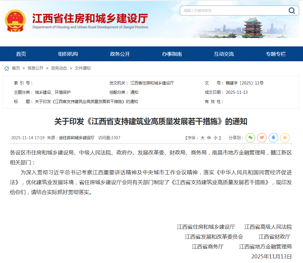 贛建字〔2025〕11號江西省支持建筑業(yè)高質(zhì)量發(fā)展若干措施