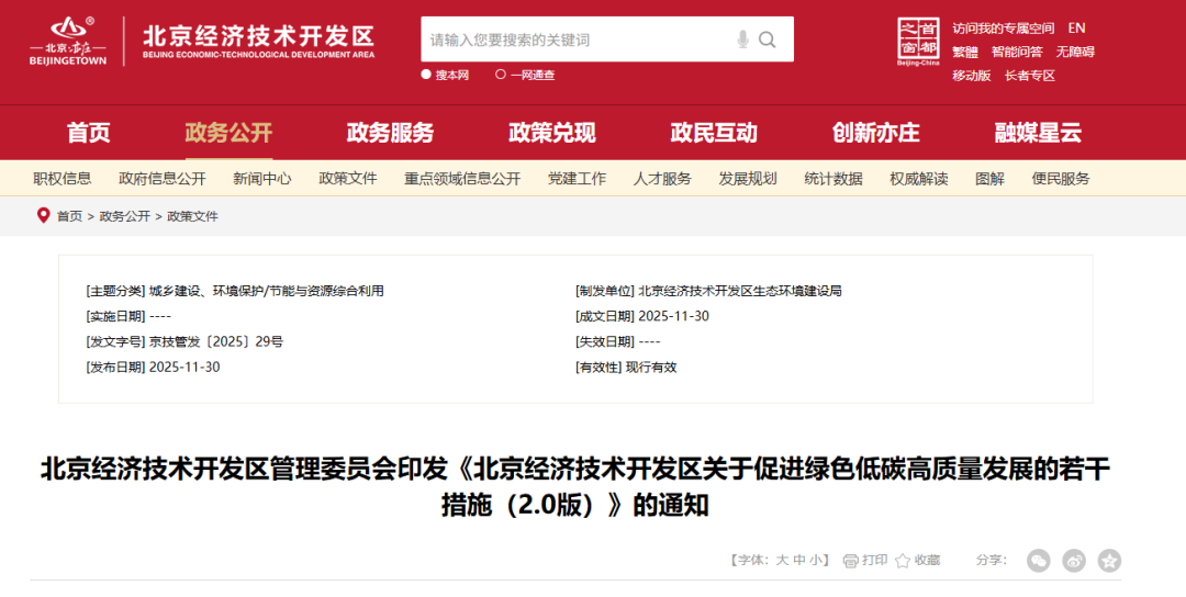 (三)本措施自公布之日起施行,施行期間如遇國家或北京市、經開區相關政策調整的,按照其規定執行。《北京經濟技術開發區促進綠色低碳高質量發展若干措施》(京技管發〔2025〕11號)同時廢止。