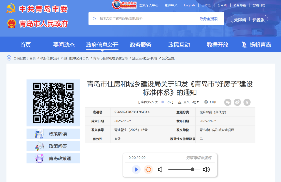 2025年12月5日,青島市正式發(fā)布全國首個《“好房子”建設(shè)標(biāo)準(zhǔn)體系》,整合1200余項(xiàng)標(biāo)準(zhǔn)構(gòu)建全鏈條全周期規(guī)范體系,這一舉措既是對國家“好房子”建設(shè)號召的精準(zhǔn)響應(yīng),也為我國居住品質(zhì)升級提供了可復(fù)制、可推廣的實(shí)踐樣本。從國家將“好房子”建設(shè)寫入政府工作報(bào)告,到地方層面出臺系統(tǒng)性標(biāo)準(zhǔn)與配套政策,我國“好房子”政策正呈現(xiàn)出清晰的演進(jìn)脈絡(luò),而青島標(biāo)準(zhǔn)體系的發(fā)布,更在政策落地、行業(yè)規(guī)范、民生保障等多個維度具有里程碑式的意義。