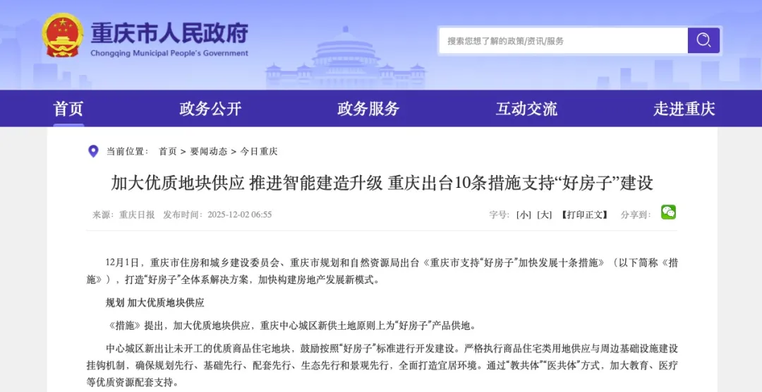 2025年12月1日,重慶市住房和城鄉建設委員會發布《好房子技術導則(商品住房)》。