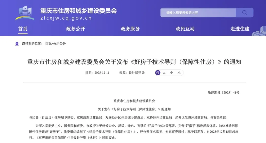 2025年12月10日,重慶市住房和城鄉建設委員會發布《好房子技術導則(保障性住房)》。