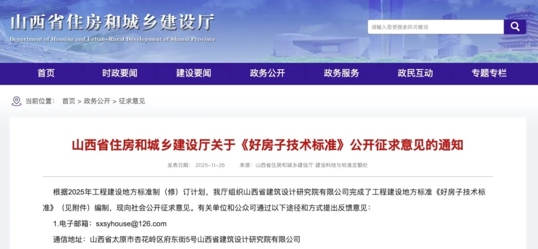 山西省 2025年11月26日,山西省住房和城鄉建設廳發布工程建設地方標準《好房子技術標準(征求意見稿)》。