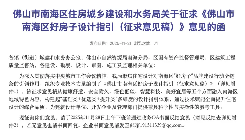佛山市南海區 2025年11月20日,佛山市南海區住房城鄉建設和水務局發布《佛山市南海區好房子設計指引(征求意見稿)》。