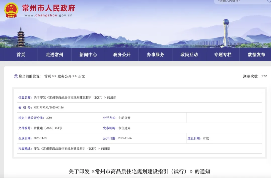 常州市 2025年11月25日,常州市住房和城鄉建設局、常州市自然資源和規劃局印發《常州市高品質住宅規劃建設指引(試行)》。