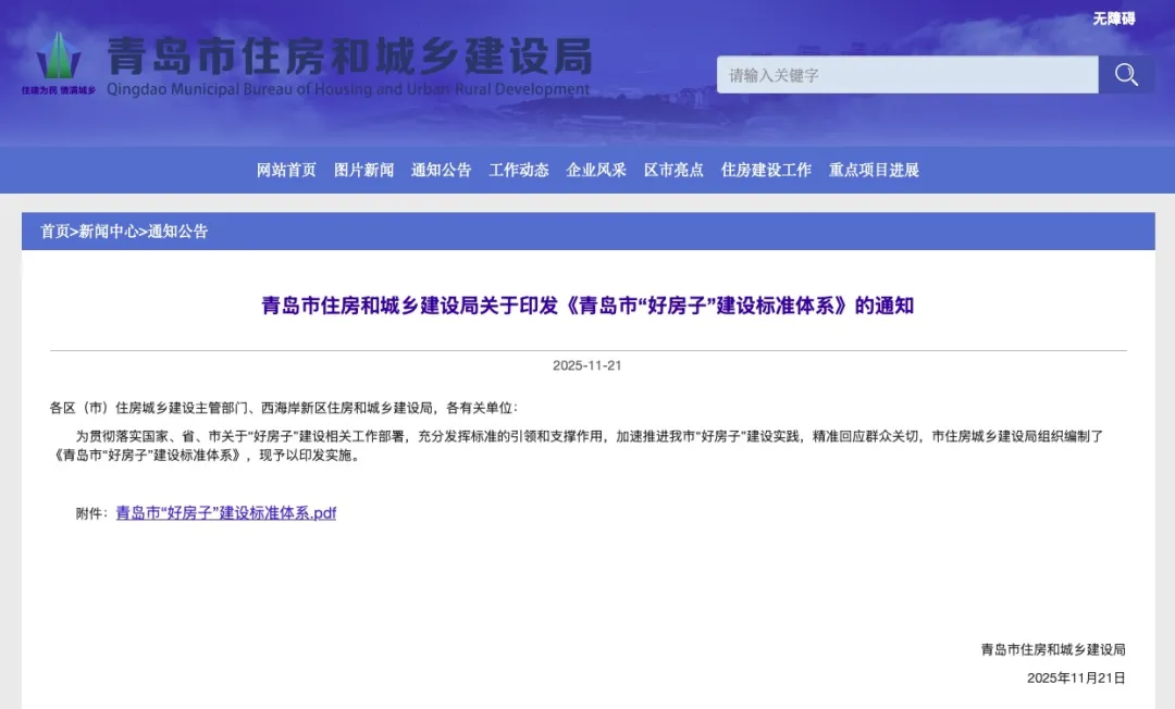 青島市 2025年11月21日,青島市住房和城鄉建設局印發《青島市“好房子”建設標準體系》,《標準體系》從住宅全生命周期和功能性能兩個維度,為“好房子”建設搭建起基礎性標準體系框架,旨在通過系統性、科學化的技術規范與政策引導,推動全市住房建設向更高品質邁進。