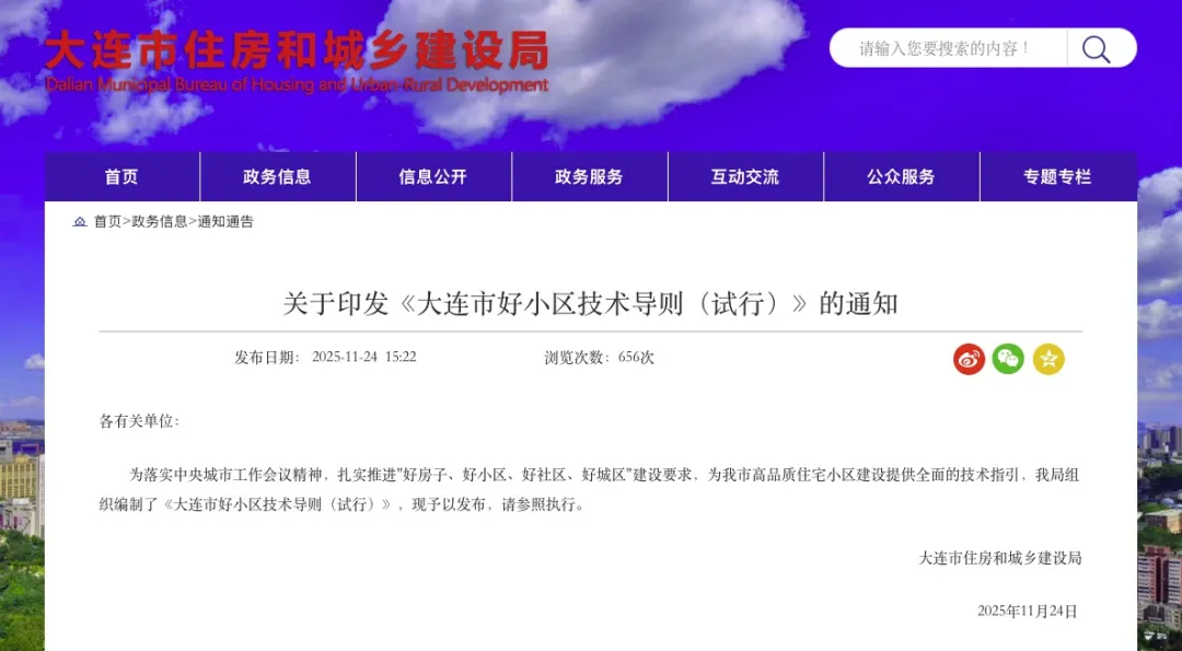 大連市 2025年11月24日,大連市住房和城鄉建設局印發《大連市好小區技術導則(試行)》。