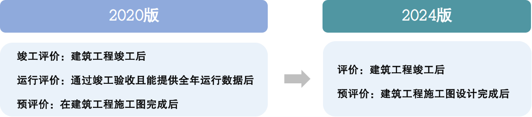 遵循國(guó)家綠色建筑評(píng)價(jià)標(biāo)準(zhǔn)框架體系,突出安全耐久、健康舒適、生活便利、資源節(jié)約和環(huán)境宜居五大綠色性能指標(biāo);綠色建筑評(píng)價(jià)階段由2020版標(biāo)準(zhǔn)的預(yù)評(píng)價(jià)、竣工評(píng)價(jià)和運(yùn)行后評(píng)價(jià)三個(gè)階段調(diào)整為預(yù)評(píng)價(jià)和建筑工程竣工后評(píng)價(jià)兩個(gè)階段。