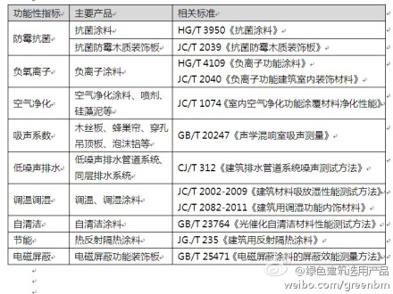 @綠色建筑選用產品: 綠色建筑需要哪些環境功能材料 使用環境功能建筑材料,可顯著改善建筑室內聲、光、熱、空氣和微生物環境。綠色建筑所需要的環境功能材料必須有標準可依,有數據支持。供應商絕不能自吹自擂,低俗炒作,如”可以吃的地板“、”可以喝的涂料“。常環境功能材料及相關標準見附圖。