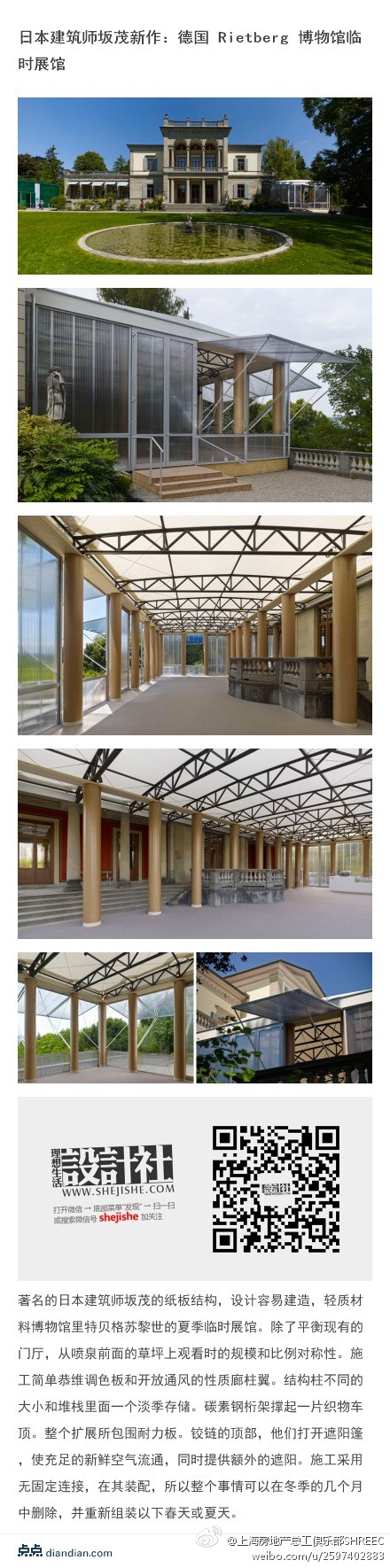 @上海房地產總工俱樂部SHREEC:綠色建筑 日本建筑師坂茂新作:德國 Rietberg 博物館:紙板結構,除了平衡現有的門廳,從噴泉前面的草坪上觀看時的規模和比例對稱性。施工簡單恭維調色板和開放通風的性質廊柱翼。結構柱不同的大小和堆棧里面一個淡季存儲。碳素鋼桁架撐起一片織物車o。整個擴展所包圍耐力板。