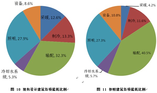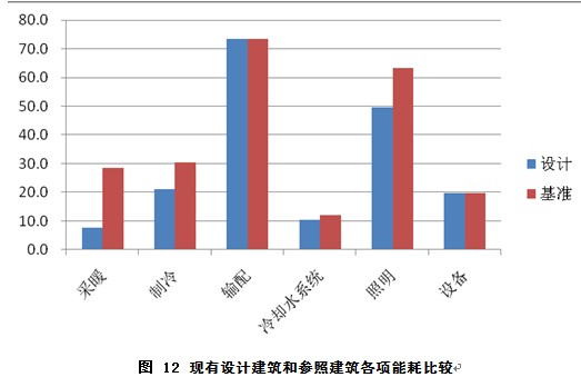 從圖12我們可以看出,現有設i的各分項能耗與基準建筑相比,均有不同程度的降低。其中,由于設計建筑空調冷熱源為地源熱泵系統,制冷COP為5.3,性能系數相比基準建筑COP為4.1的地源熱泵冷源有了一定的提高,采暖COP為4.5,性能系數相比基準建筑效率為0.86的燃氣鍋爐熱源有了大幅提高,同時設置了熱回收裝i,因此采暖系統的節能貢獻率最大,達到45.8%。