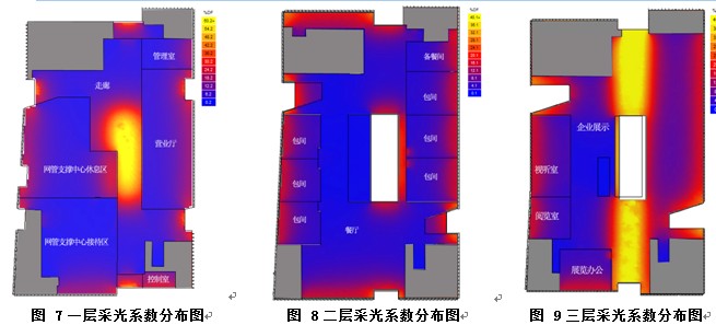 大樓充分利用了自然采光,在屋頂中部設置一s大面積自然采光中庭,采光天窗面積334平方米,配合大面積的玻璃幕墻,最大限度地引入自然光,增大了各樓層自然光的采光面積,同時為建筑使用者提供了舒適的工作與休息環境。通過Ecotect軟件進行的采光模擬可以看出(見圖7、圖8和圖9),采光系數大于2%的區域面積為3747.7平方米,整個建筑的自然采光系數達到88.7%,滿足北京市《綠色建筑評價標準》的要求。在大樓地下一層連通1#樓的地下通道屋頂上,沿通道行走方向設計了一個大面積條形屋頂天窗,全陰天工況下,連廊的采光系數能達到1%以上,起到了引導作用,并為地下一層創造了自然的氛圍。