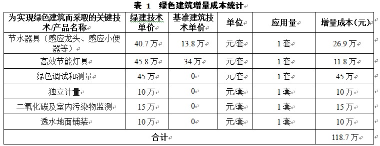 該綠色建筑的增量成本主要由節能節水的技術應用,室內舒適環境的創造,以及高效運營的系統搭建等方面構成。在節能技術上,項目主要采用了地源熱泵機組,二氧化碳以及室內污染物艱澀設備,以及智能遮陽系統、智能排風系統的結合,同時大樓采用了高能效e的制冷主機;在節水技術上,項目采用了高效的節水器具;大樓綠色建筑總增量成本約為118.7萬元,單位面積增量成本為101.0元/m2。